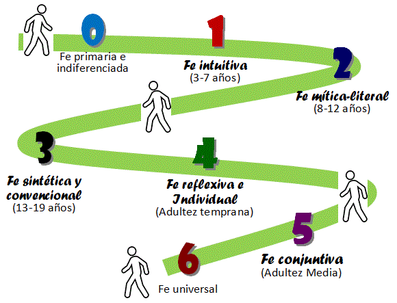 Fowler deja saber de manera clara que entender el desarrollo de la fe no es tarea fácil. Esto debido a la existencia de una diversidad de factores que se tienen que considerar, tales como: la maduración biológica, el desarrollo emocional y cognitivo, la experiencia psicosocial y el papel de los símbolos, los significados y las prácticas religiosas y culturales, incluso el género y la raza. La gran diversidad de variables hace que el movimiento de una etapa a otra etapa no sea automático ni seguro. Así que no es de extrañarse que existan personas que cronológicamente sean adultos, pero en cuestión del desarrollo de la fe estén anclados en una etapa comúnmente asociada con la niñez. De igual modo, aunque con mayor limitación, se puede encontrar un niño que refleje una fe relacionada con una de las etapas asociadas con el adulto[2]. Veamos grosso modo las etapas del desarrollo de la fe.